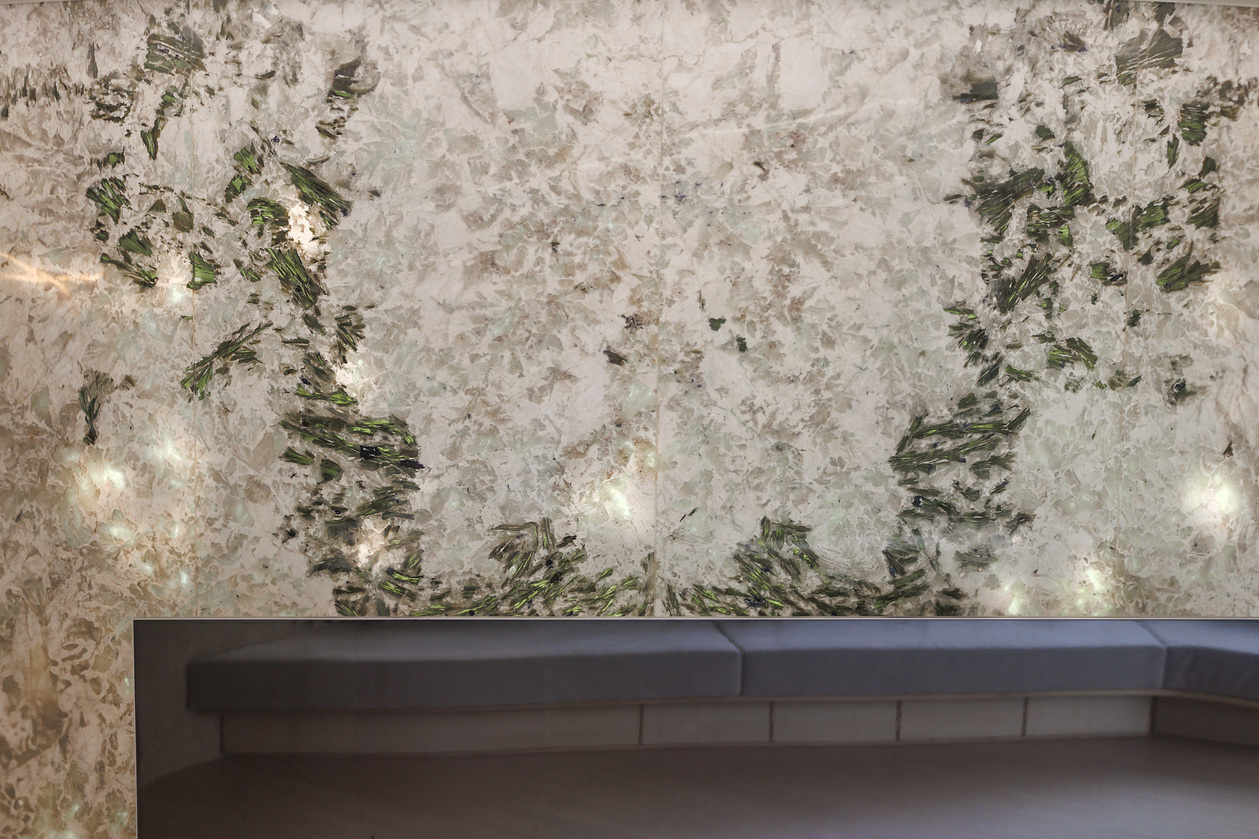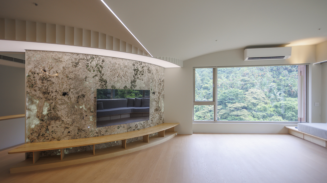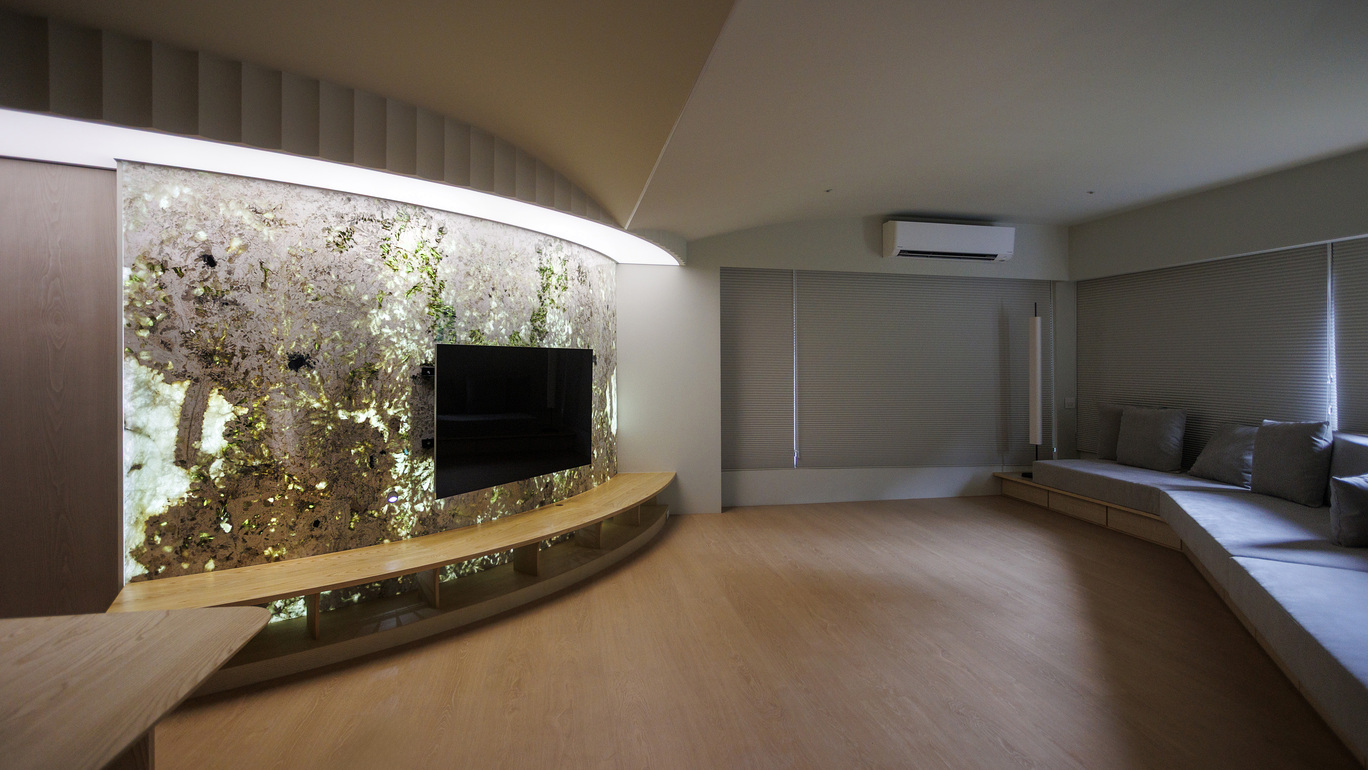 那是一道以「天使之星」打造的弧形主牆。對於石材,王采元認為,若空間尺度不足,或環境條件無法承載石材的歷史感與氣勢,便不該浪費這天然的恩賜。然而,當她想起曾在藝博會遇見這塊透光帶綠、紋理又十分雅緻的「天使之星」,便感覺它有足夠的能量回應住宅所面對的景觀,「好像我走在樹隙之間,看到天光的感覺」,既能成為視線焦點的點睛之筆,又能引景入室。她形容,夜晚關上燈,僅以微光映照石牆時,石材彷若把室外的樹影偷渡了進來,「甚至有人看到這件作品的夜拍,真以為我後面藏了一棵樹!」