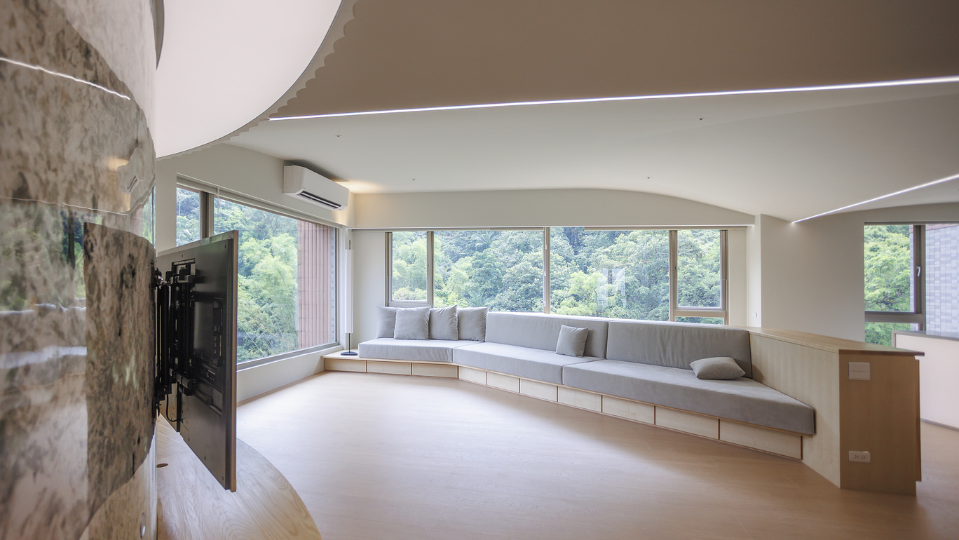 言及嘗試新事物,「沐浴在光中」這件作品,在業主完全放手、全力支持的前提下,王采元在格局與材料上都有不同以往的嘗試。坐擁矗立眼前的山景綠林,該住宅作為一家人的主要起居、社交及工作的「別館」,需要同時承載宴客、工作室與家務收納的多重機能。她打開原本阻隔的格局,引入自然通風與採光,使居住者視線所及,皆能與窗外景致相遇。而沙發的斜向布局,對之以圓弧石牆承接起視線的流動,亦化解了結構梁帶來的壓迫感。