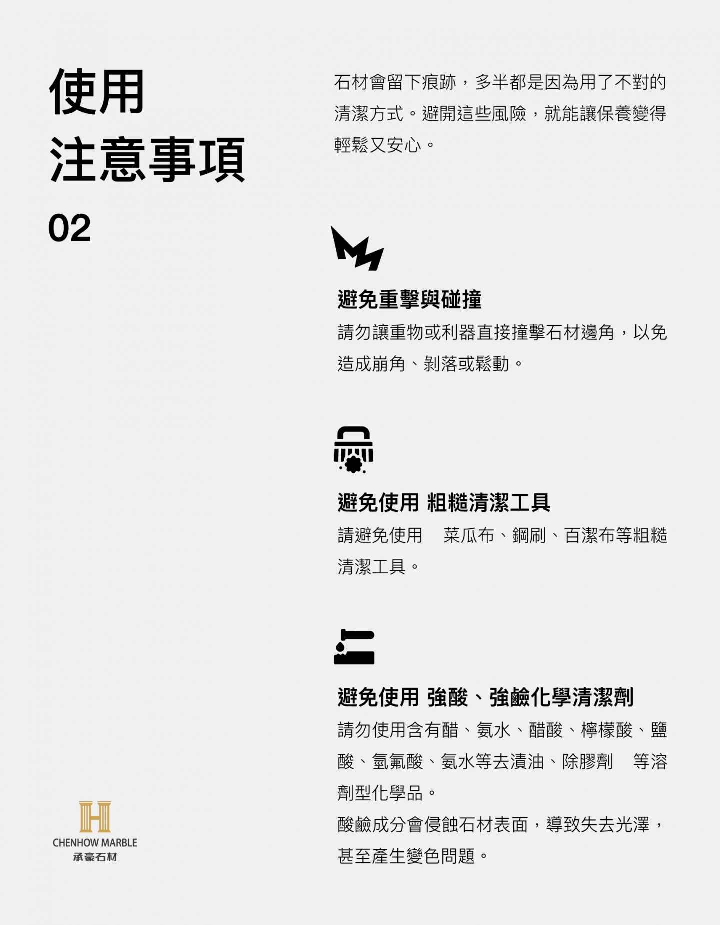 - 強酸、強鹼化學清潔劑:請勿使用含有醋、氨水、醋酸、檸檬酸、鹽酸、氫氟酸、氨水等去漬油、除膠劑 等溶劑型化學品。酸鹼成分會侵蝕石材表面,導致失去光澤,甚至產生變色問題。