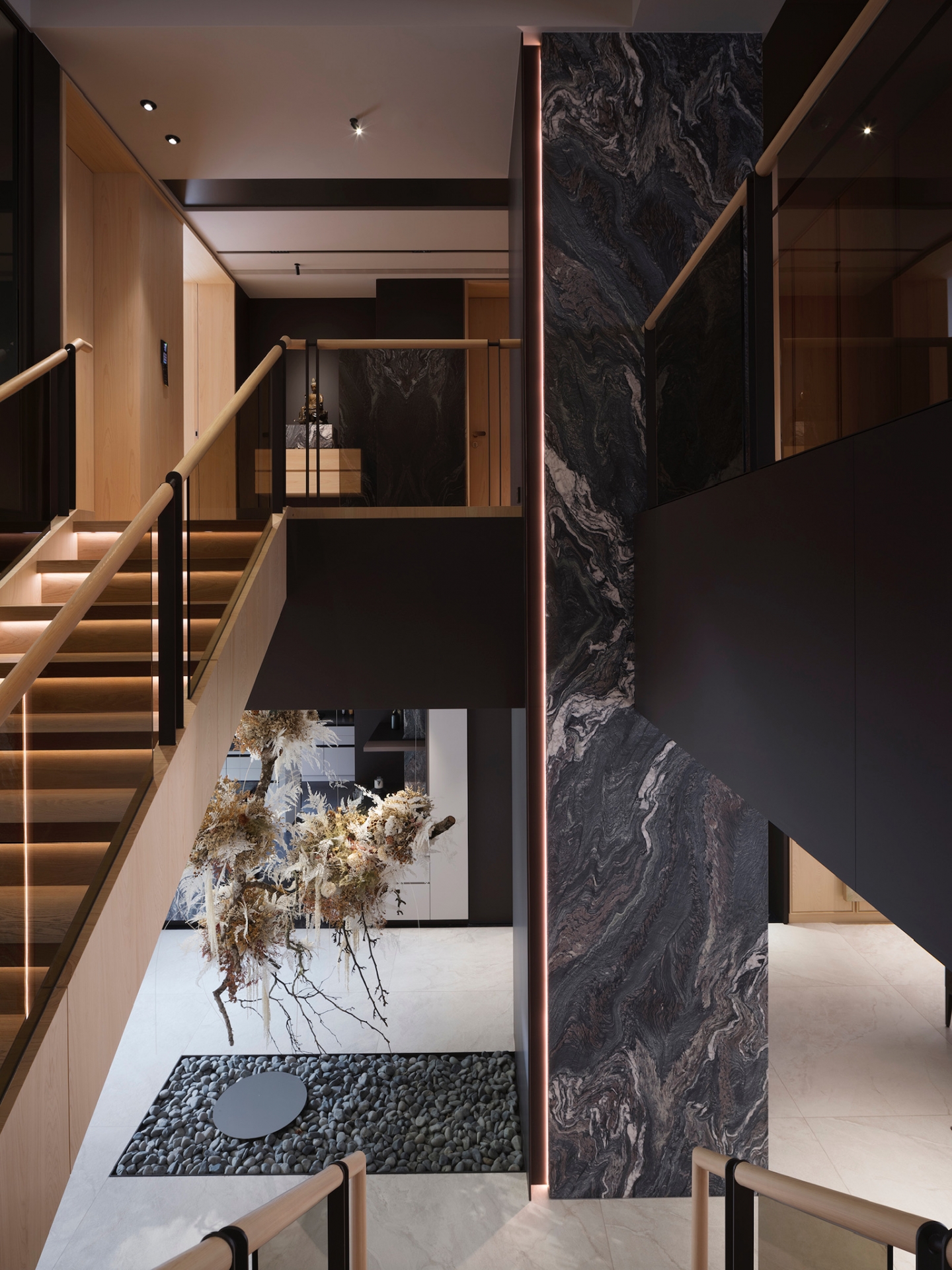 森境+王俊宏 設計的《香遇》,以素雅的檜木作為空間基底,客廳的柱體、茶室的壁面、樓梯的牆體、吧台的檯面等皆選用紋理磅礴的龍鳳石串連樓面。當居住者的視線被天然石材吸引,沿著檜木踏階、扶手的香氣與溫潤,觸動嗅覺的感知,讓人猶如徜徉在大自然般悠然自在。