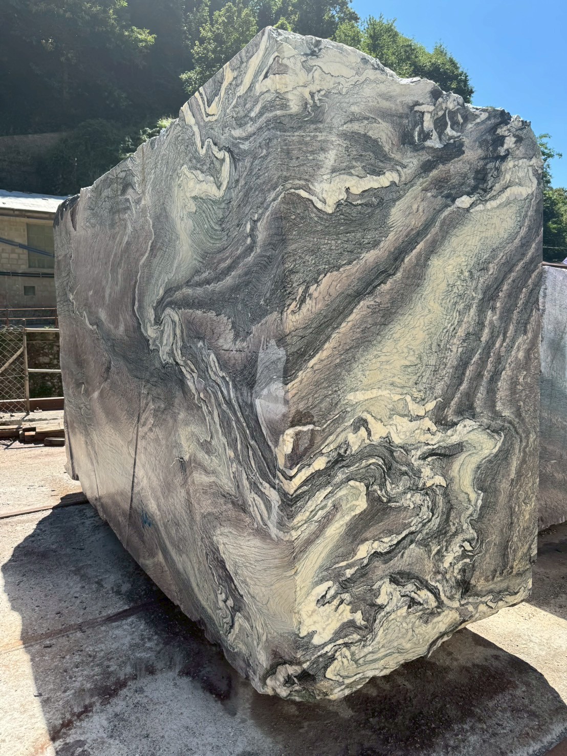 「Cipollino」在義大利文中意為「洋蔥」,形容其層層波紋般的紋理結構,紫色、深綠與象牙白層層交錯,如年輪般展開,彷彿封存地球的時間軌跡。這種強烈而具識別度的視覺語言,使龍鳳石成為經典的義大利石材之一。