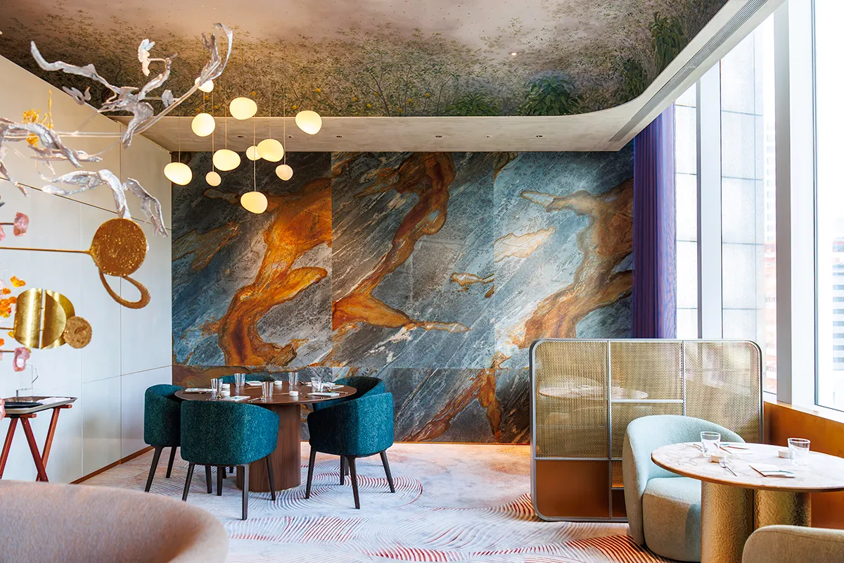 李霽:這家旗艦店是結合咖啡與餐飲體驗的獨立 Lounge,我在創作時考量了產地、族群、媒材質地、都會氛圍與工藝技術,經歷琢磨而形塑成作品的語彙。《解壓縮》與《滙載》融入了咖啡香氣、蘇門答臘地景、紅色成熟果實、果香與礦石結晶的意象,而這些色彩與承豪石材的#藍絲絨 竟然那麼契合。那深藍的礦物質感、流淌的金沙岩礫,就像我創作中的能量波動,這確實是一次奇妙的共振。