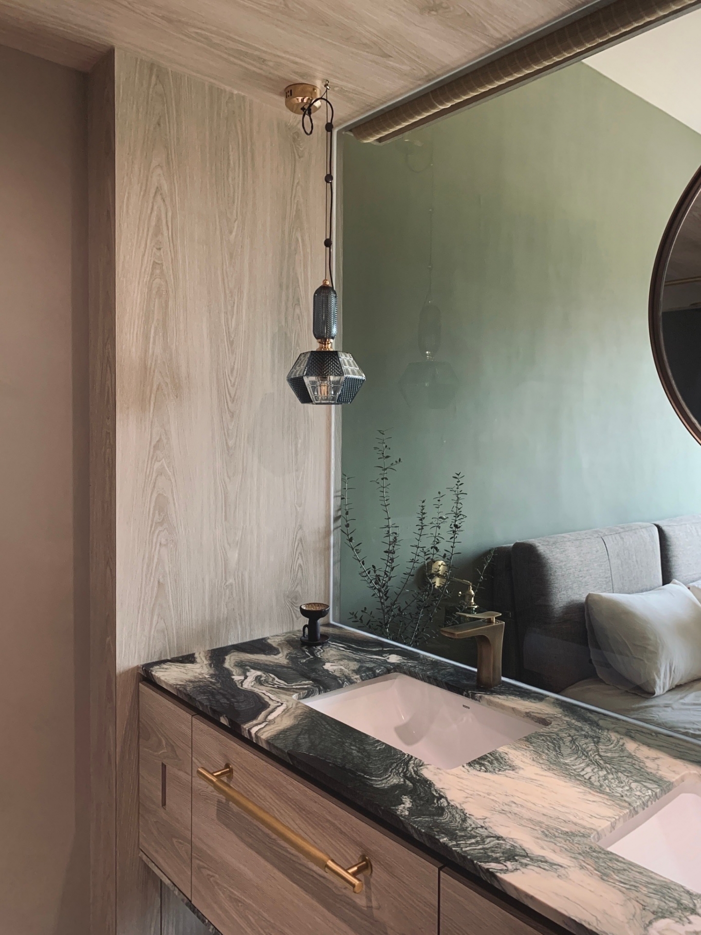 由執見設計操刀的高雄黃宅,一對喜愛綠色年輕夫妻,選用龍鳳石作為衛浴檯面,與木皮搭配出溫潤的質感,滿足屋主對於低調奢華美學,也體現設計團隊對於材質配選的高敏銳度。