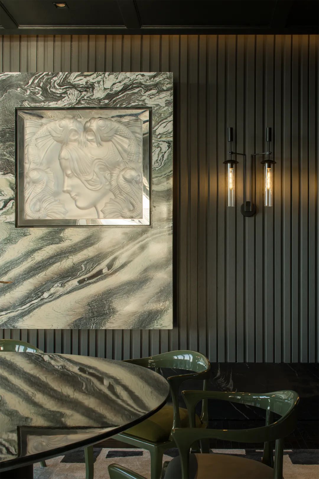 壹方設計於上海的作品中以「上海腔調」為設計理念,來自上海人長時間累積而成的生活修養,從居室中一件家具的選擇與擺放,到服裝上一粒盤扣的位置,追求的是比例、質感與象徵意義之間的平衡,構成了上海獨有的優雅秩序,轉化為屬於當代的設計表達。在此脈絡下,龍鳳石被運用於牆面裝飾,成為藝術表現的一部分,使牆面同時具備結構性與觀看價值;它既界定空間的邊界,也回應上海所講究的細節層次與生活品味,讓材質、藝術與空間情緒在同一平面上自然交會。