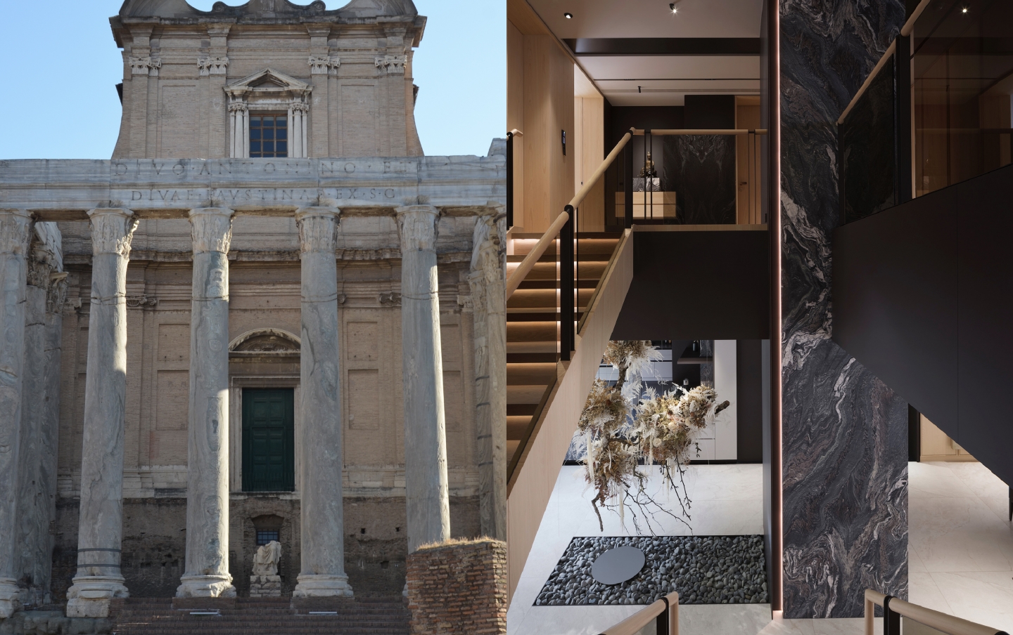 義大利安東尼努斯與法斯提娜神殿(Temple of Antoninus and Faustina)前廊的龍鳳石柱子,到當代居家設計中,龍鳳石成為串穿空間的軸線,橫跨了2000年,在不同時代、不同空間被重新詮釋。