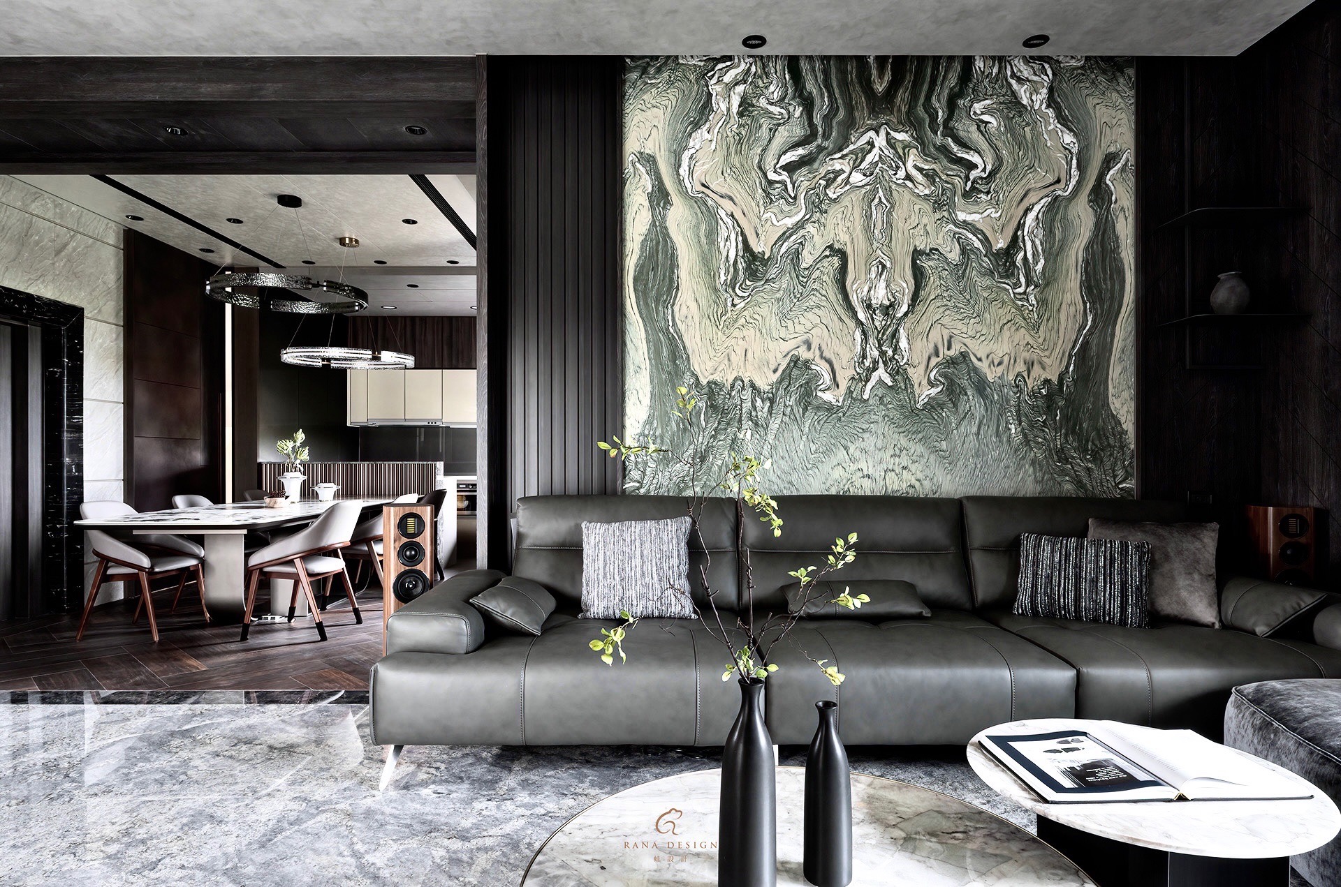 蛙設計住宅設計中,將龍鳳石運用於沙發背牆,成為客廳空間中最具份量的精神軸線。龍鳳石的紋理層次鮮明、尺度感強烈,乍看之下極具存在感,甚至帶有一種近乎張揚的氣勢。然而在實際空間中,透過比例控制、邊界留白與材質過渡,使其自然融入日常生活場景之中。