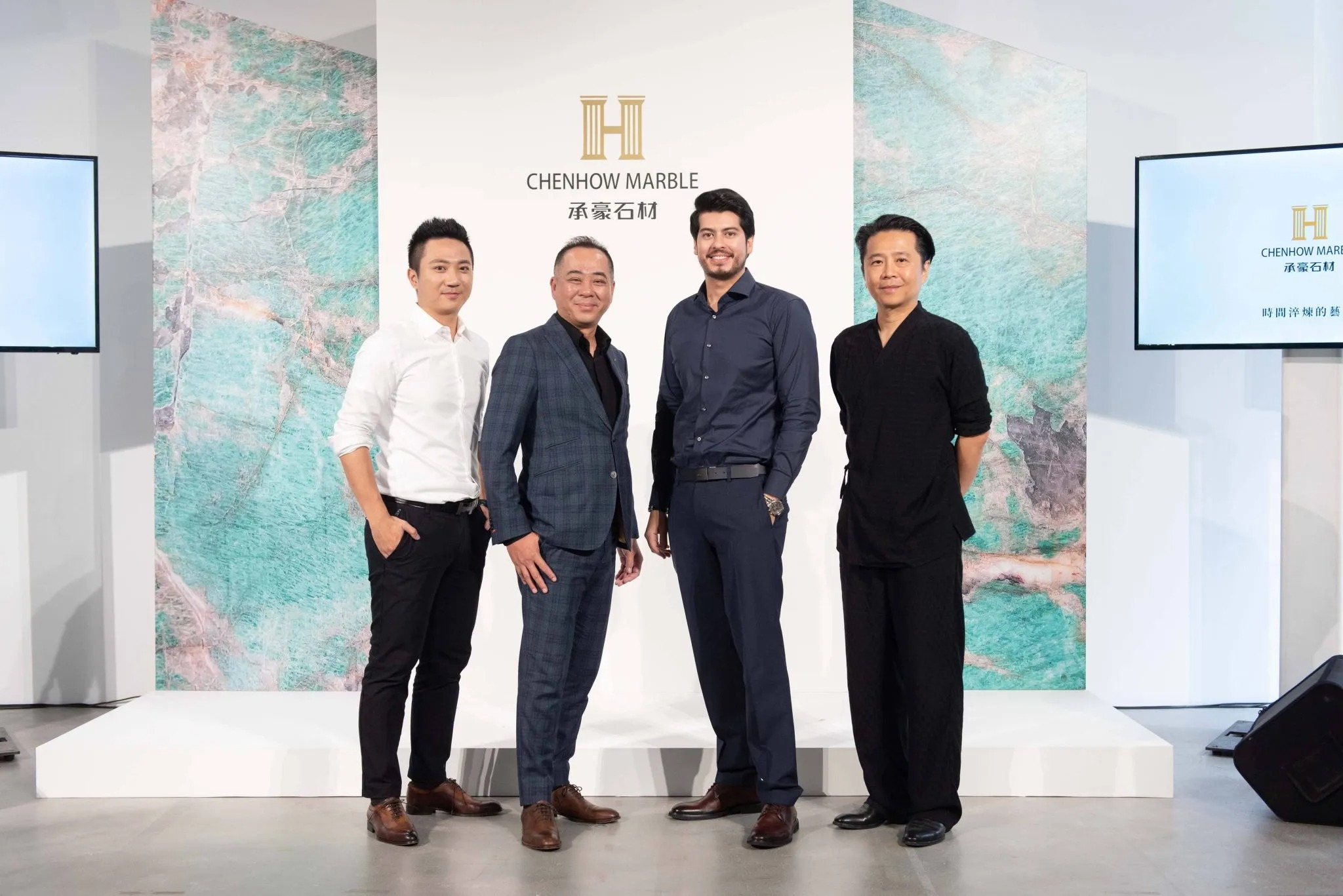 承豪石材攜手巴西最大Tiffany奢石礦主,共同啟動「奢石永恆藝術計畫」。左一:承豪石材有限公司品牌長 陳昱愷、左二:承豪石材有限公司董事長 陳博崑、右一:双方藝廊創辦人 胡朝聖、右二:Granistone CEO Hugo Meneses