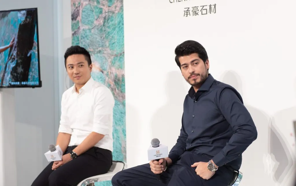 承豪石材與巴西Tiffany礦區簽下在台獨家代理權,區域獨家代理模式將Tiffany奢石引進台灣。圖左:承豪石材有限公司品牌長 陳昱愷、圖右:Granistone CEO Hugo Meneses奢石與藝術跨界對話