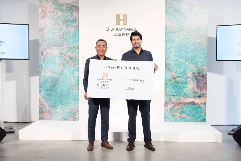 承豪石材與巴西Tiffany礦區簽下在台獨家代理權,區域獨家代理模式將Tiffany奢石引進台灣。圖左:承豪石材有限公司品牌長 陳昱愷、圖右:Granistone CEO Hugo Meneses