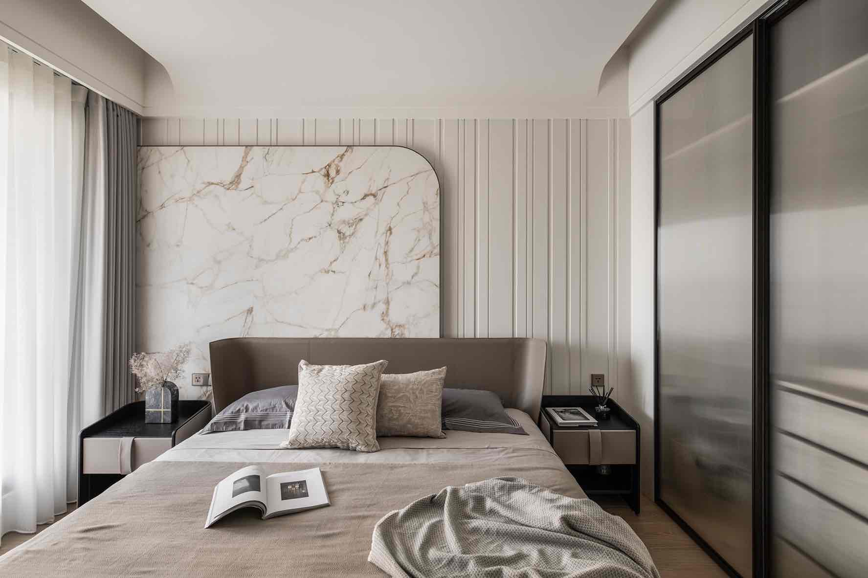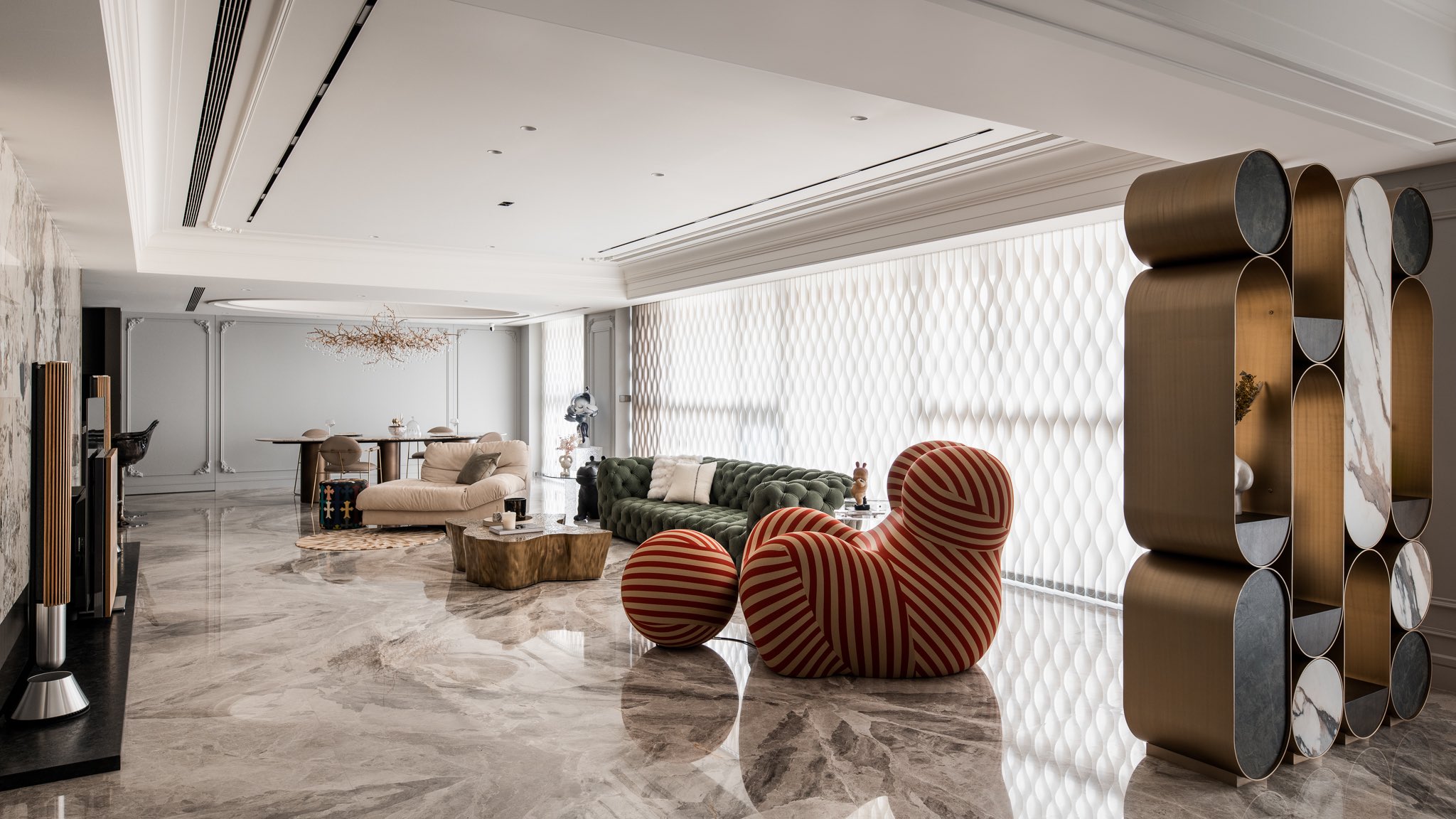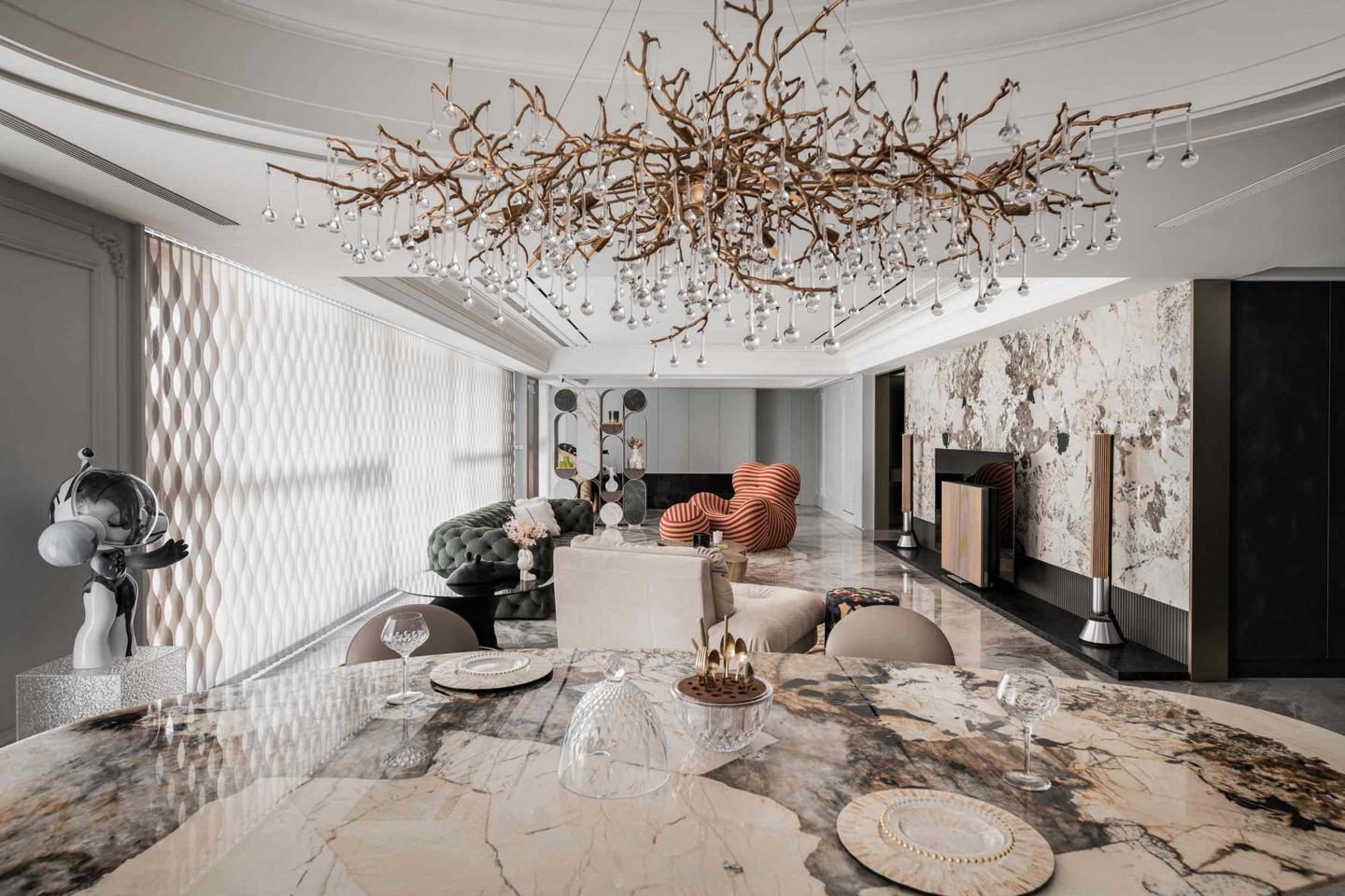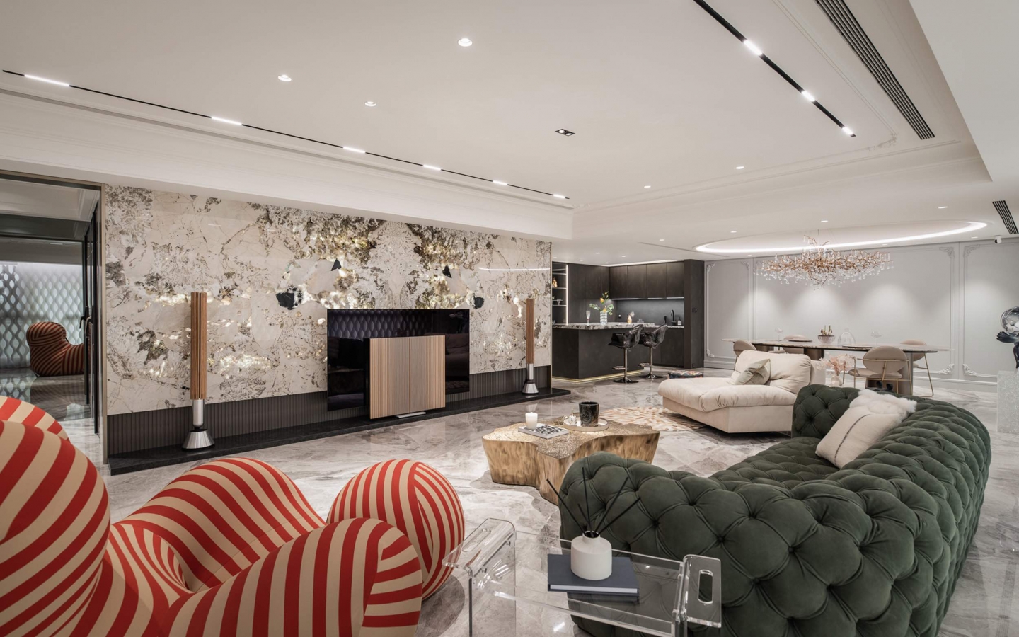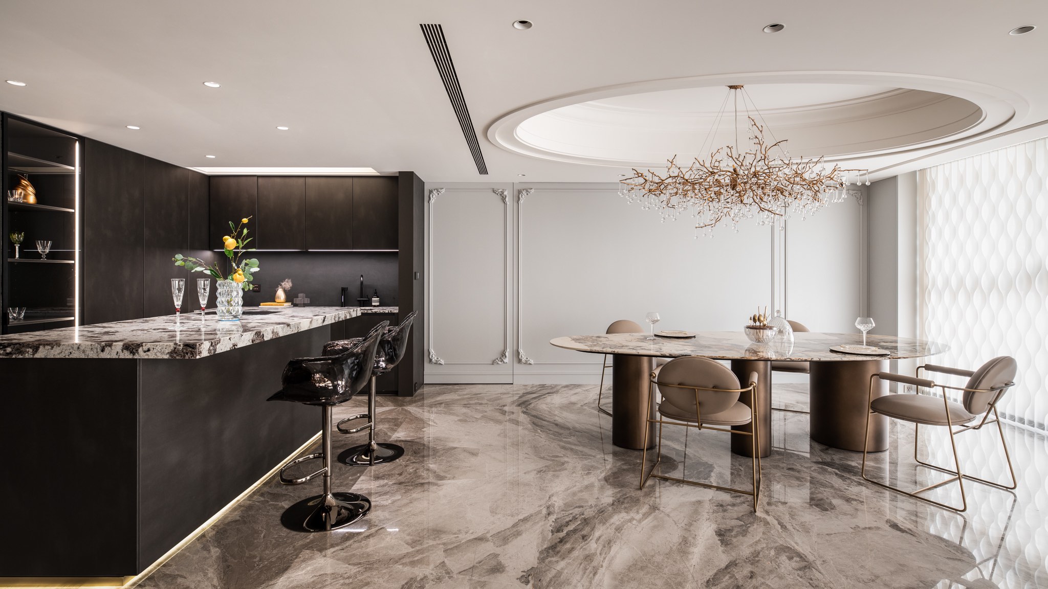 為展現專屬的個人風格和時尚感,以天然石材為重,在各個空間中展現出獨特的質感並且互相搭配。暖灰色系大紋路石材的地坪結合立面的金屬與木質烤漆,打造出獨特而富有層次的空間氛圍。電視背牆帶有透亮石材牆面柔和的光澤,讓空間看起來更加明亮和通透。另外,發光的石材牆面於夜晚時,和都市夜景互動,更能產生時尚的都會感。餐廚區透過多樣的天然石材製作成吧檯、餐桌與經典家具結合,自然光影與人造光源的互動加上寬敞的佈置和視線,讓人猶如置身於畫廊之中。主臥內使用弧形線條和皮革與石材產生對比。主臥背牆藍色的石材與軟裝色系的搭配,呈現出濃厚的個人風格,完全呼應出奢石和空間軟裝的互動。
