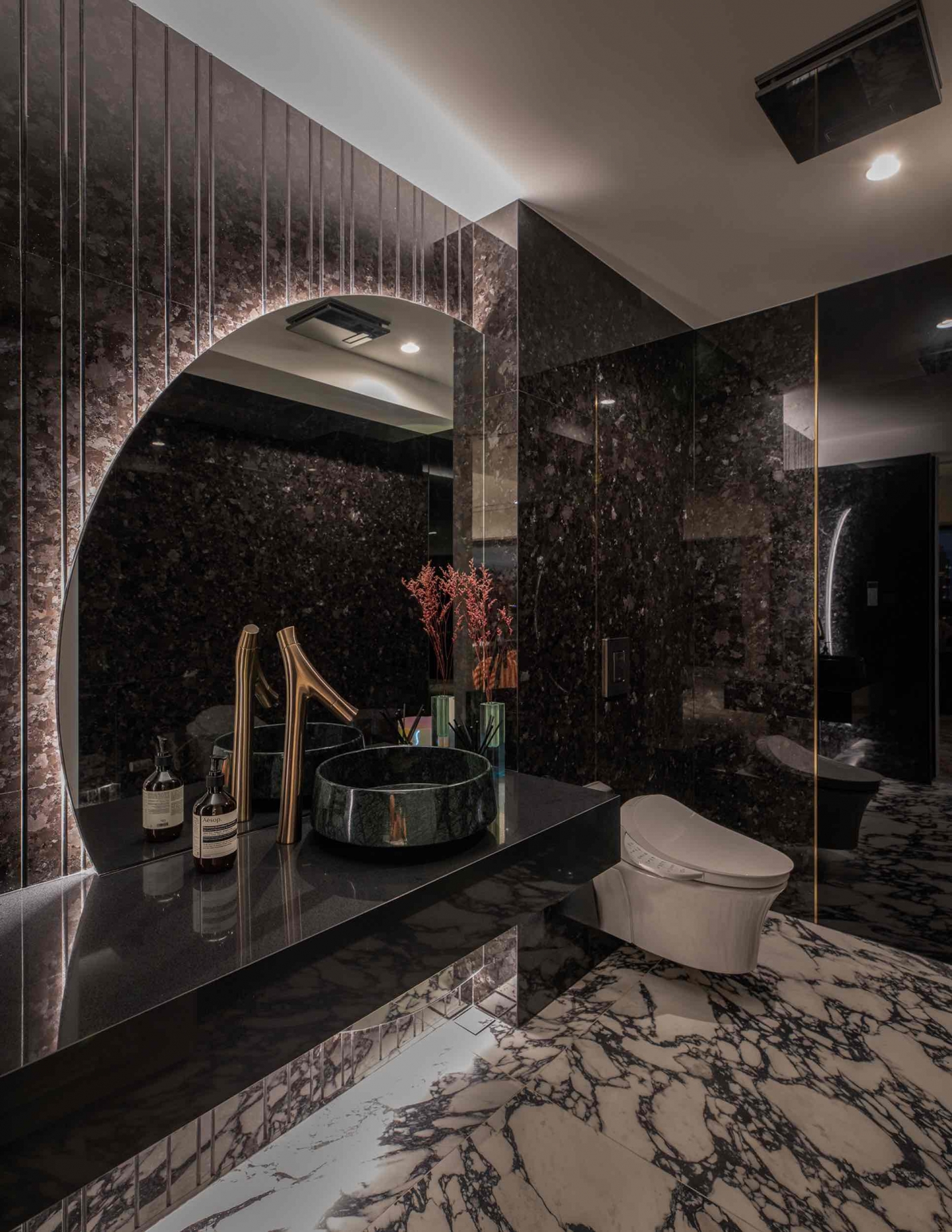 經典是一種耐得住時間的淬鍊,也是經得起審美的檢驗,經典更是一種流傳久遠的生命意涵。我們見到電視背牆柔和如玉的潤澤,發光的石材牆面彷若幽石生芙蓉,細品客廳及延伸至吧檯、餐桌的石材,紋理或疏或密,御飛龍之蜿蜒,透出一股勃勃生機的大器之美,最精彩的是衛浴間,紋理或如漣漪,或如阡陌,或如水波,尤其鑲嵌明鏡的石材線條表現,以形取勝,以韻動心,以紋動人,是點睛之作。整體石材運用均透露了主人的心情、意境及氣質,幻變出空間的萬種風情,也彰顯家園巍峨,成為經典的不凡。